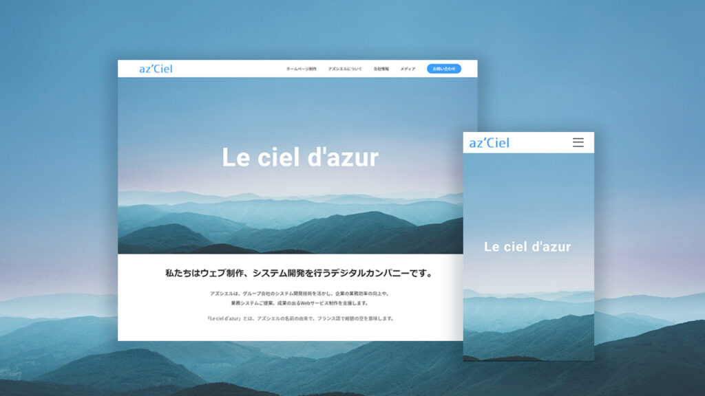 幻想的な山と空を背景に、浮かび上がる「Le ciel d’azur」の文字。ユニークなメインビジュアルは、アズシエルを意味しています。アズシエルの名前の由来はフランス語の「Le ciel d’azur(ル シエル ダジュール)」から来ており、紺碧の空を意味しています。