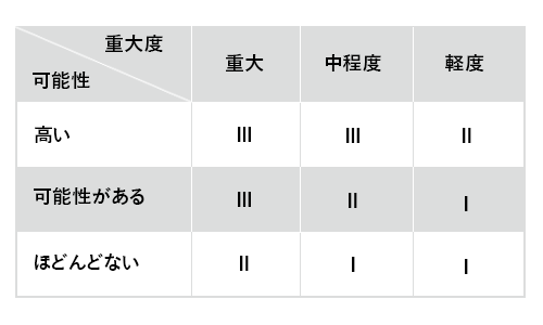 リスクレベルとは、リスクの優先度のことです。リスクには、リスクの重大度(重篤度[じゅうとくど])と発生の可能性という二つの度合いがあり、これらの組合せでリスクレベルを見積もります。リスクレベルは、次のようなリスクマトリックスで決定します。